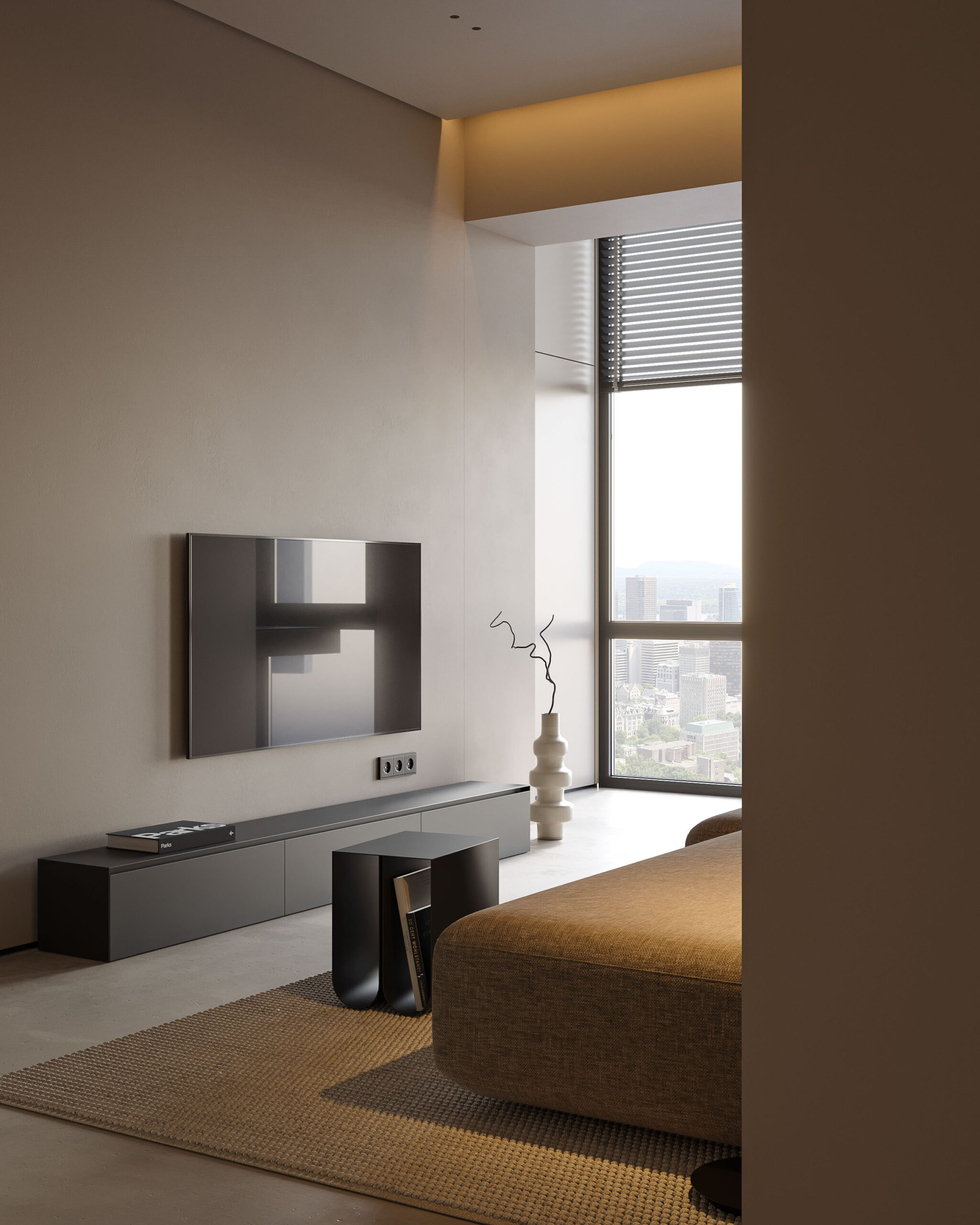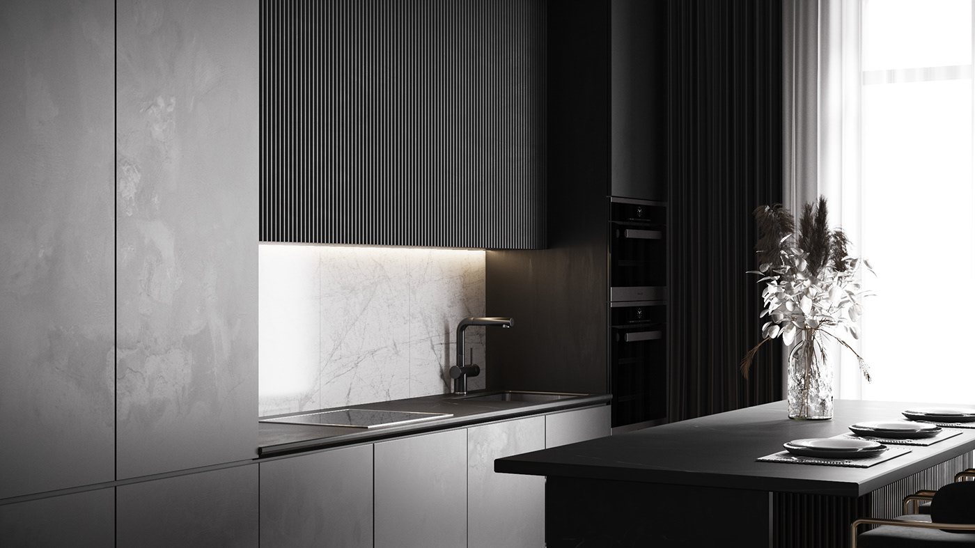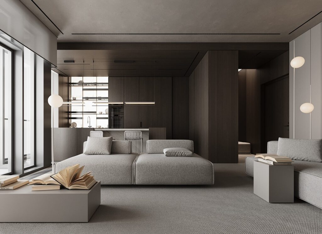Màu sắc đơn sắc và vật liệu như gỗ tối màu cùng ánh sáng mềm mại tạo nên một không gian ấm cúng và sang trọng.Kết hợp với các đường nét thiết kế mang đến sự thư thái cần thiết trong một không gian sống. Sự phối hợp không gian giữa các khu vực cho thấy sự linh hoạt trong việc sử dụng không gian, điển hình của phong cách hiện đại.