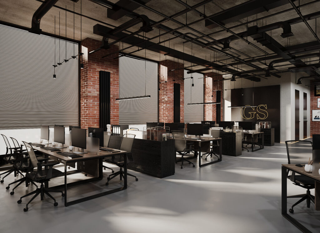 Thiết kế tập trung vào phong cách công nghiệp với các yếu tố như gạch thô, hệ thống đường ống, tạo ra một không gian làm việc độc đáo và mạnh mẽ. Sử dụng đồ nội thất màu đen và gỗ mang lại cảm giác chắc chắn và tập trung nhấn mạnh không gian làm việc rộng lớn và linh hoạt. Các khu vực làm việc mở và kết nối hợp tác giữa nhân viên.
